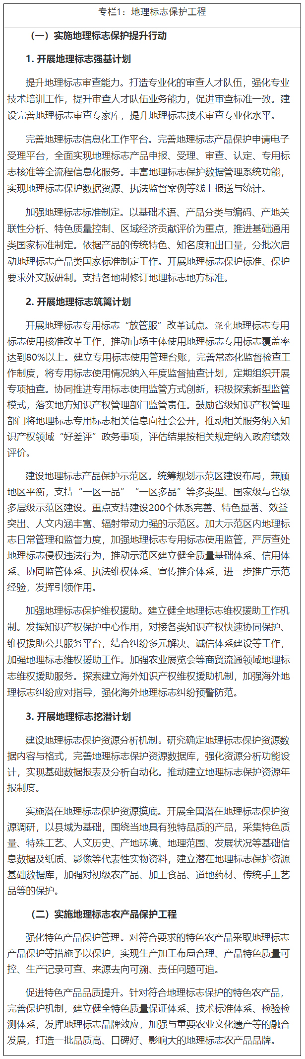 1. 健全地理标志法律制度。积极推动地理标志专门立法工作,深入开展地理标志立法调研论证,加强国外地理标志法律制度比较研究,健全专门保护与商标保护相互协调的统一地理标志保护制度。明晰地理标志的权利内容和保护范围,明确行政保护的基本原则、管理机关的监管职责和相关市场主体的权利义务,优化地理标志保护程序,提高地理标志保护水平,构建中国特色地理标志保护法律制度。(条法司、保护司、商标局按职责分工负责)