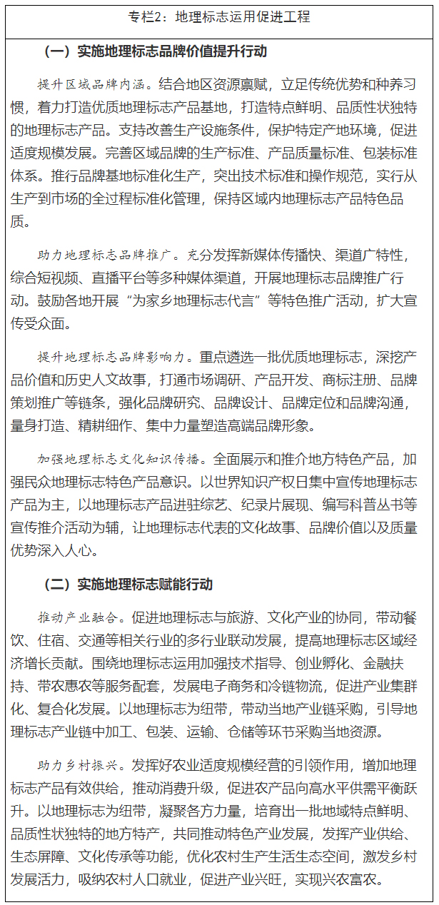 ——地理标志运用效益更加凸显。地理标志品牌效应显著提高,地理标志产品的市场竞争力有效增强,以地理标志品牌为核心,企业商标和区域品牌相结合,共同发展的地理标志品牌体系更加完善,地理标志相关产业链更加健全。